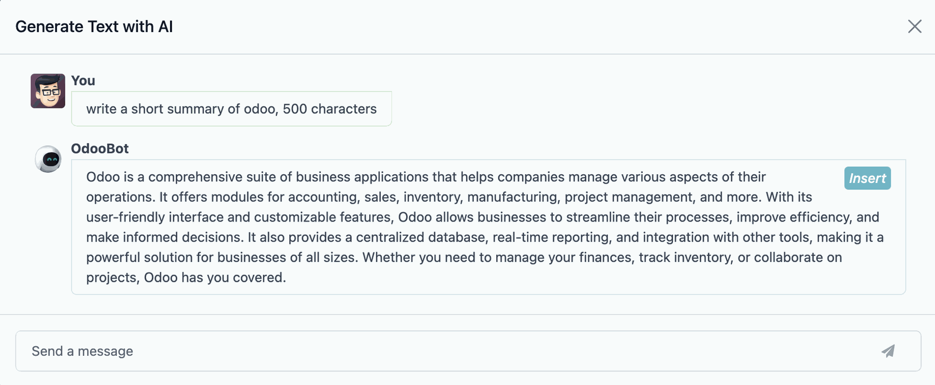 ChatGPT has been integrated with the new version of Odoo. You can now use it to generate alternatives for your text across the apps. You can also use it to create a text from scratch. The AI copywriter tool offers a range of text suggestions for every need. It is the perfect tool to use when you want to amp up your email marketing, landing pages or knowledge articles. The possibilities are endless!