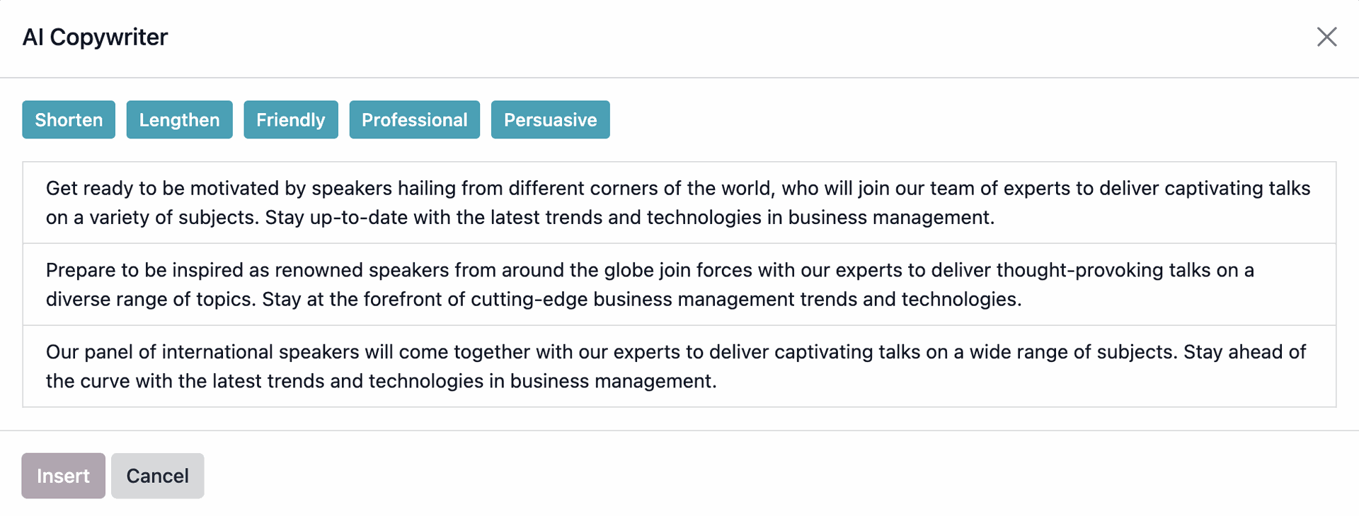 - Select the alternative text you like and click on Insert.