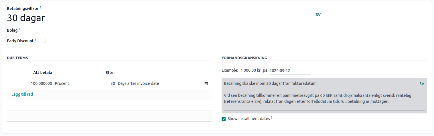 Betalningsvillkoren anges tydligt på fakturan. Du kan även ställa in dröjsmålsränta och påminnelseavgifter under Konfiguration i bokföringsappen. Här har du full flexibilitet att anpassa reglerna efter dina behov.