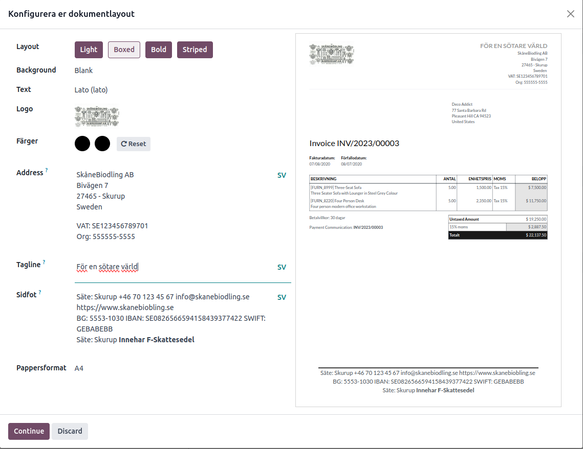 Sist men inte minst kan du anpassa fakturans layout och typsnitt i Odoo under Inställningar > Bolag. Här väljer du hur fakturan ska se ut, inklusive logotyp och andra detaljer som sidfot och adressfält.
